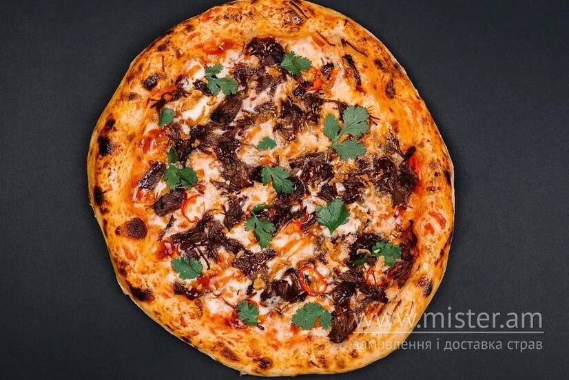 Томатна основа, моцарела, яловичі щоки, соус BBQ леквар, кінза, перець Чилі, цибуля кріспі + соус часниковий.