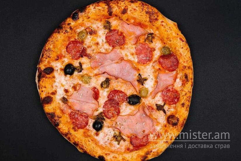 Томатна основа, моцарела, шинка, салямі, оливки, каперси фрі, орегано + соус часниковий.