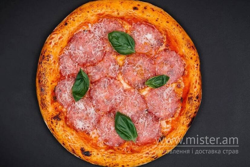Томатна основа, моцарела, салямі Napoli, пармезан, базилік + соус часниковий.