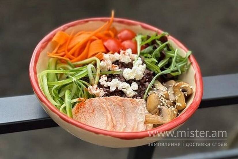 Сніданковий боул з індичкою, чорним рисом, томатами чері, свіжою морквою, печерицями, сиром фета, міксом зелені та кунжутом. Подаємо з гірчичною заправкою.