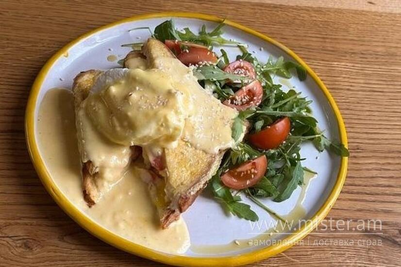 В тостовому хлібі філе-сувід курки, яйця, сири чедер та пармезан. Подаємо з соусом бейконез, міксом зелені, томатами чері та яйцем пашот.