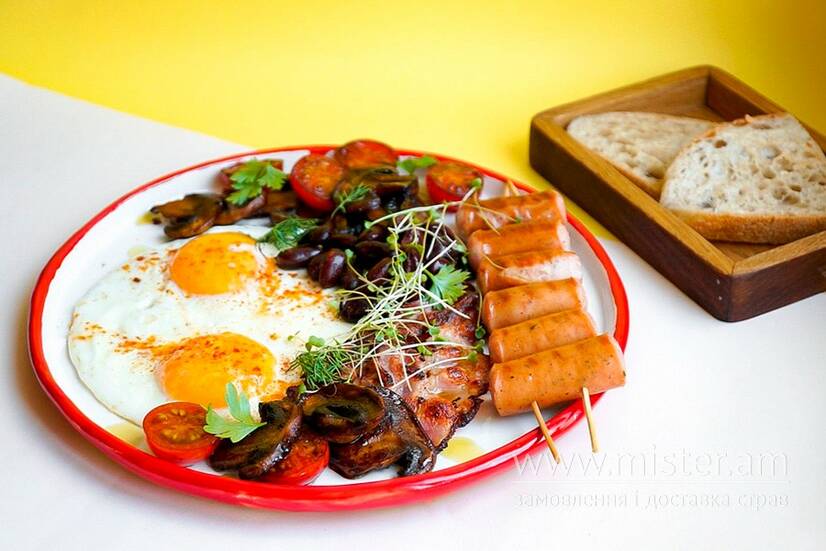 Ковбаски гриль, бекон, яйця, печериці, чері, квасоля.