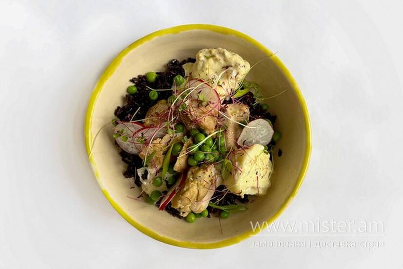 Ніжне м`ясо курча з чорним рисом та цвітною капустою, вершковий соус, зелений горошок.