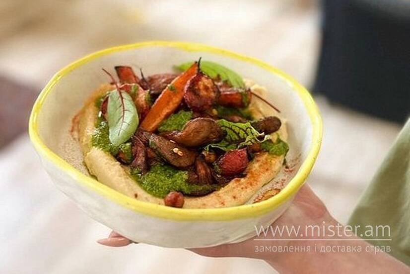 Хумус з запеченим редисом, морквою, гливами та нутом.