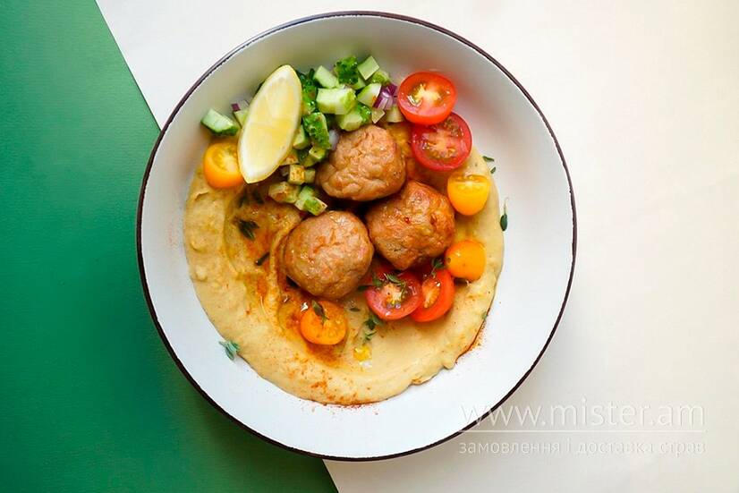 Мітболи печені, хумус, томати чері, огірок свіжий, цибуля, лимон, оливкова олія.