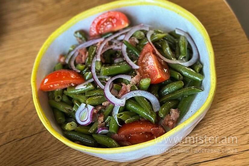 Стручкова фасоля з підсмаженим беком, чері томатами та синьою цибулею.