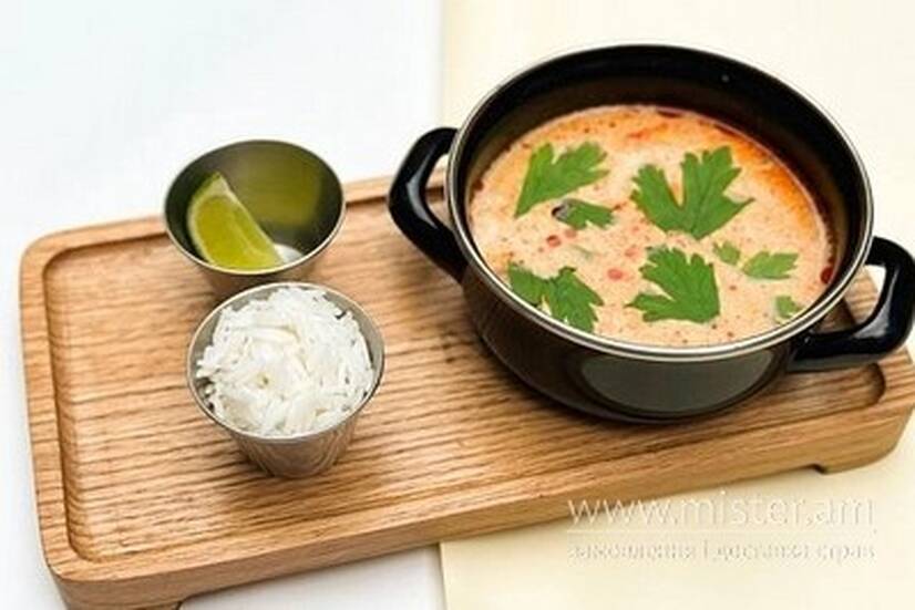 Бульон Том ям, кокосове молоко, рис, гриби гливи, томати чері, лайм.
