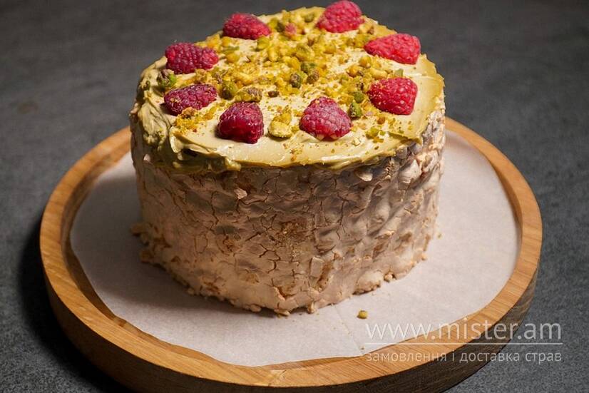 Торт меренговий з фісташковим кремом, лохина, фісташка.