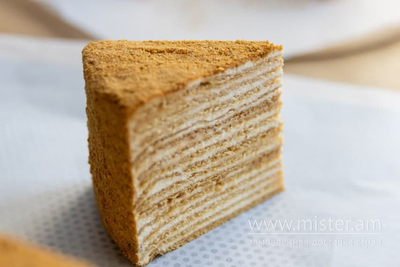 Медові коржі, сметанковий крем, карамельний соус, мигдалева крихта.