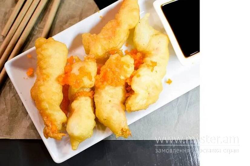 Креветка тигрова, тісто темпура, ікра Тобіко, соус темпура.