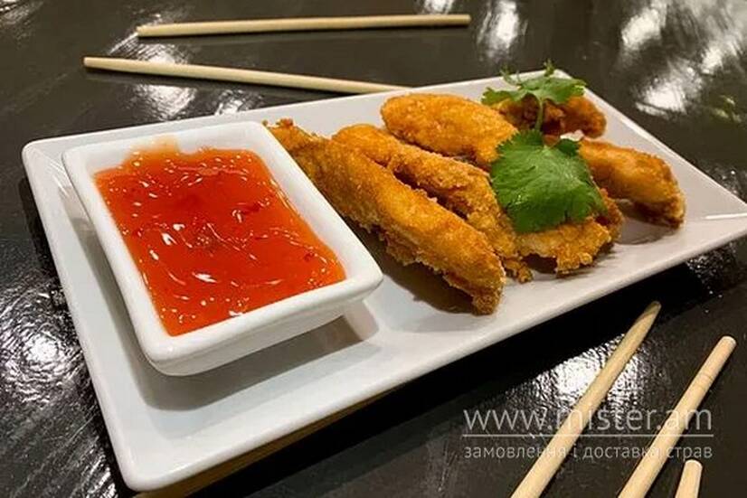 Куряче філе, сухарі Панко, соус солодкий-чилі, кінза.