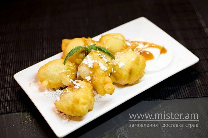 Банан, тісто Темпура, цукрова пудра, топінг карамельний, морозиво "Пломбір", м`ята.