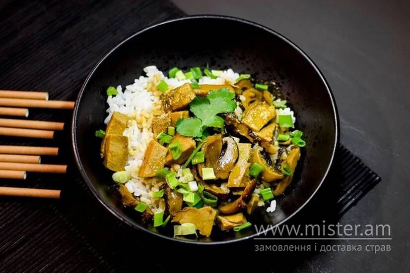 Гриби шиітаке, куряче філе, рис, часник, імбир, зелена цибуля, кінза, соус на вибір: