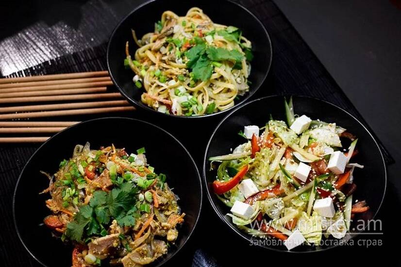 Локшина Рамен зі свининою, локшина Скляна зі свининою, Салат "Ясай" з фетою.