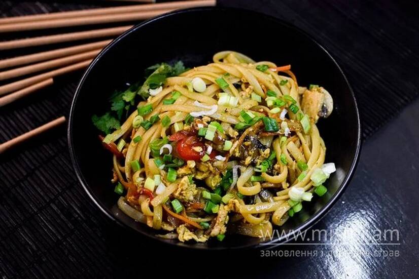 Локшина яєчна, яйце, морква, перець болгарський, цибуля ріпчаста, гриби печериці, часник, імбир, курка, цибуля зелена, кінза. Соус на вибір.