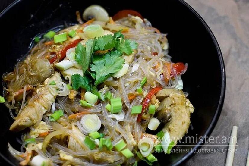 Локшина рисова, яйце, морква, перець болгарський, цибуля ріпчаста, гриби печериці, часник, імбир, курка, цибуля зелена, кінза. Соус на вибір.