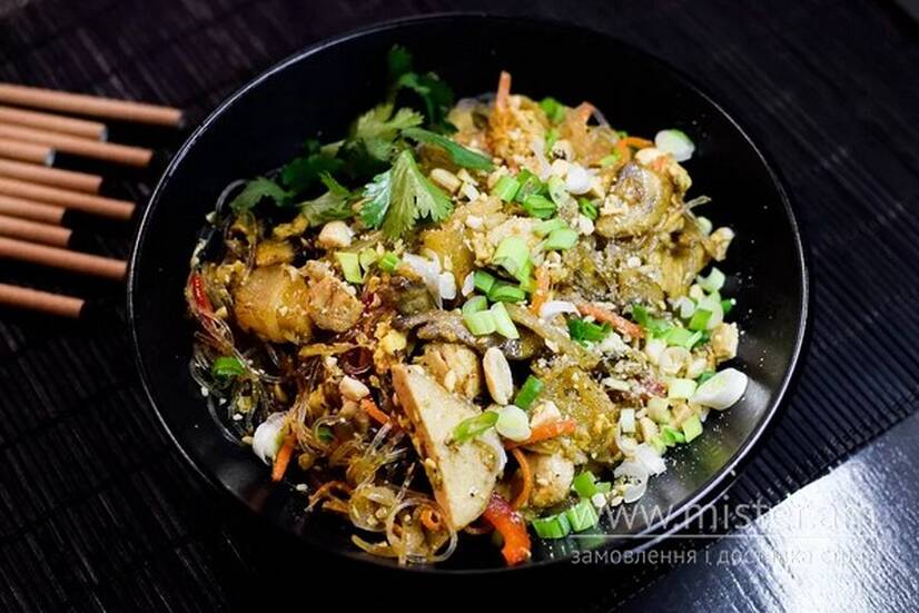 Локшина рисова, яйце, морква, перець болгарський, цибуля ріпчаста, гриби печериці, часник, імбир, курка, ананас, цибуля зелена, кінза. Соус на вибір.