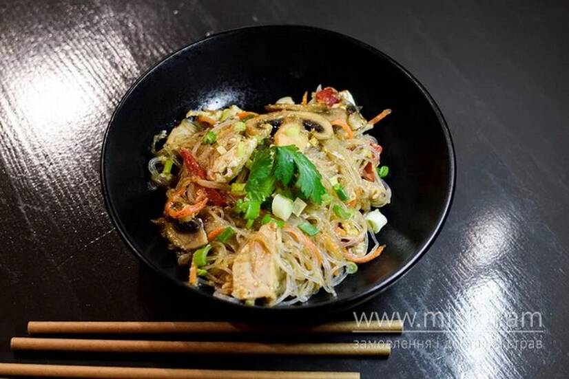 Локшина рисова, яйце, морква, перець болгарський, цибуля ріпчаста, гриби печериці, часник, імбир, свинина, цибуля зелена, кінза. Соус на вибір.