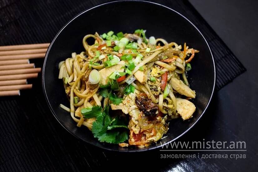 Локшина пшенична, яйце, морква, перець болгарський, цибуля ріпчаста, гриби печериці, часник, імбир, курка, цибуля зелена, кінза. Соус на вибір.