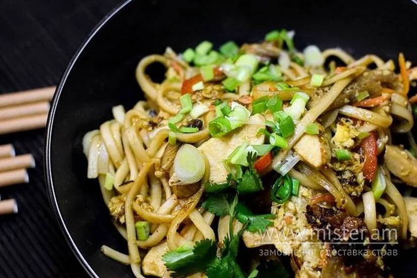Локшина пшенична, яйце, морква, перець болгарський, цибуля ріпчаста, гриби печериці, часник, імбир, свинина, цибуля зелена, кінза. Соус на вибір.