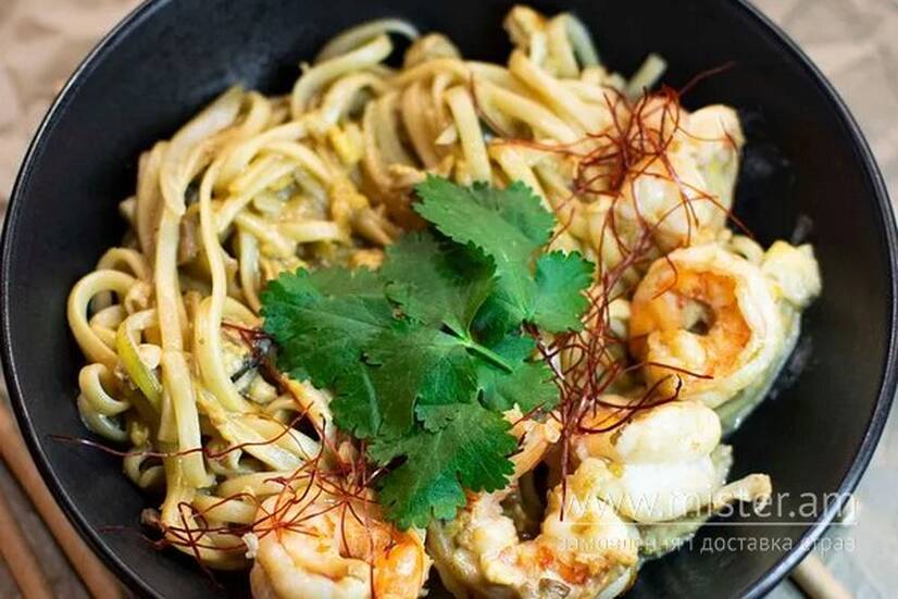 Локшина удон, печериці, креветки, вершки, цибуля ріпчата, соус теріякі-перцевий, нитки чилі.