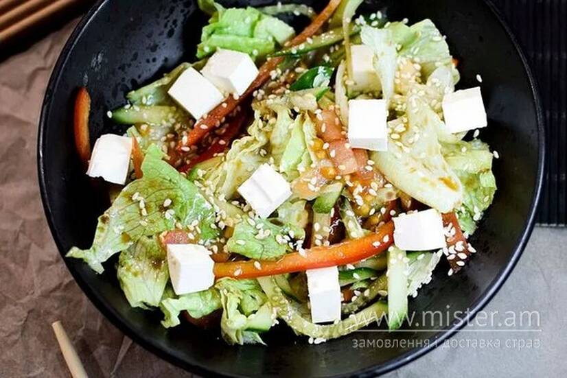 Салат Айсберг, огірок, помідор, перець болгарський, соус на основі соєвого, сир фета, кунжут.
