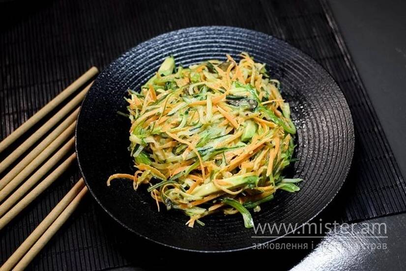 Морські водорості вакааме, морква, огірок, авокадо, гриби шиїтаке смажені соус горіховий.
