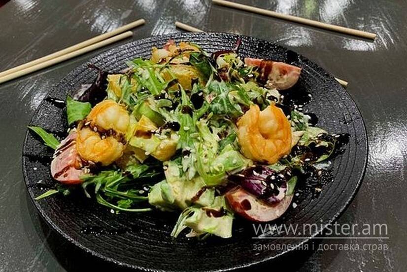 Мікс салату, авокадо, креветки тигрова, апельсин, томати чері, кунжут,соус вершковий, соус унагі.
