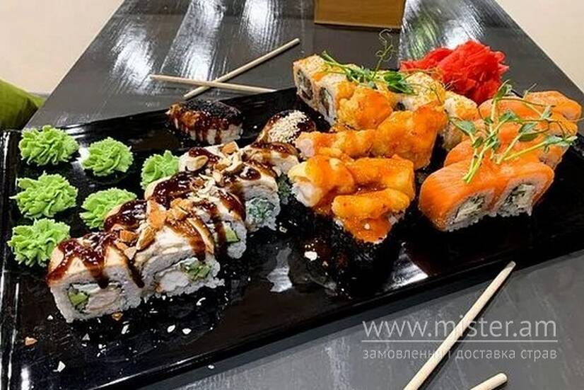 Макі лосось 2 шт., рол "Філадельфія", рол "Тай", рол "Філадельфія" в кунжуті з лососем.