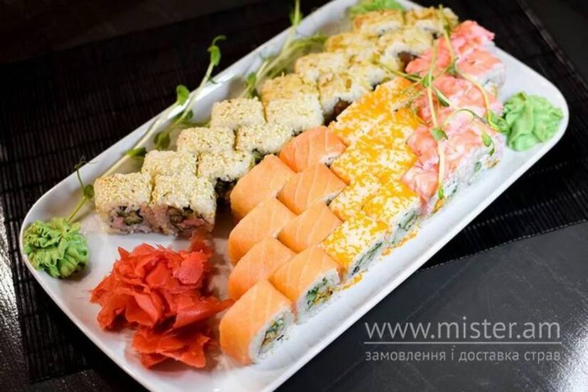 Рол "Боніто з лососем", рол "Ебі", рол "Каліфорнія в ікрі з вугрем", рол "Каліфорнія в кунжуті з креветкою", рол "Червоний дракон".