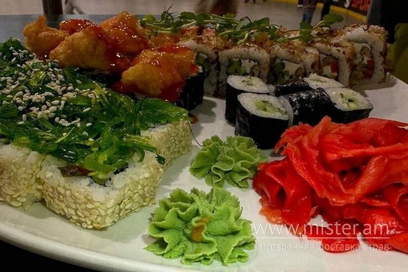 Рол "Філадельфія", рол "Вугор -паприка-боніто", рол "Креветка темпура", рол "Хіяші", макі "Каппа".