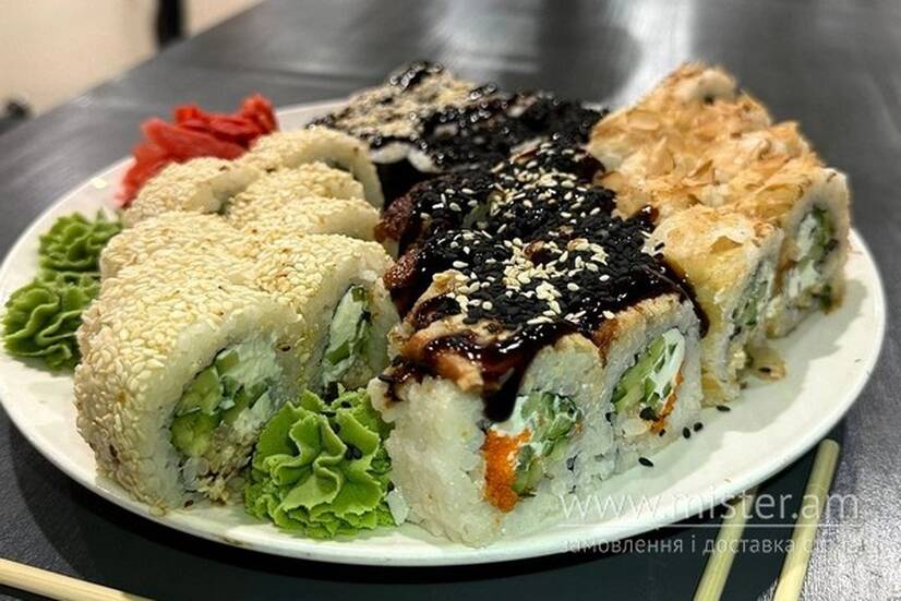 Макі "Унагі" 2 шт., рол "Філадельфія в кунжуті з вугрем", рол "Чорний дракон", рол "Вугор паприка боніто".