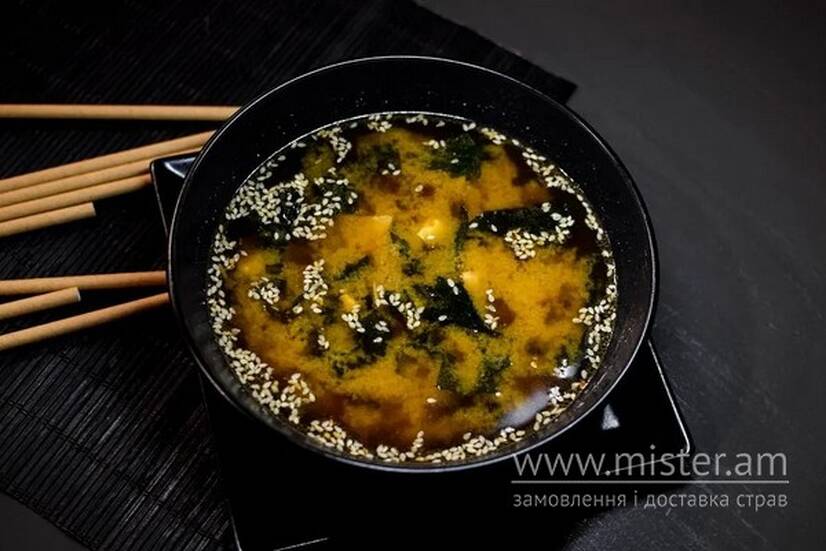 Місо-бульйон, сир Тофу, вугор, водорості Wakame, кунжут.