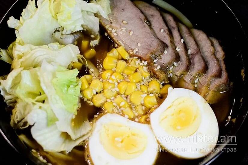 Бульйон для супу Рамен, локшина Рамен, качка, гриби шиїтаке, кунжут, яйце, кукурудза, салат Айсберг, норі.