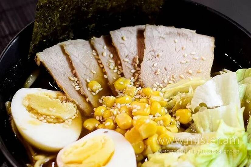 Бульйон для супу Рамен, локшина Рамен, свинина, гриби шиїтаке, кунжут, яйце, кукурудза, салат Айсберг, норі.
