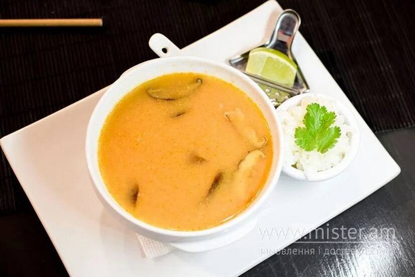 Бульйон для супу Том-Ям, молоко кокосове, гриби шиїтаке, курка, паста Том-ям, кінза. Подається з відварним рисом та лаймом.