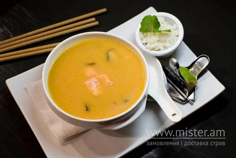 Бульйон для супу Том-Ям, молоко кокосове, гриби шиїтаке, лосось, паста Том-ям, кінза. Подається з відварним рисом та лаймом.