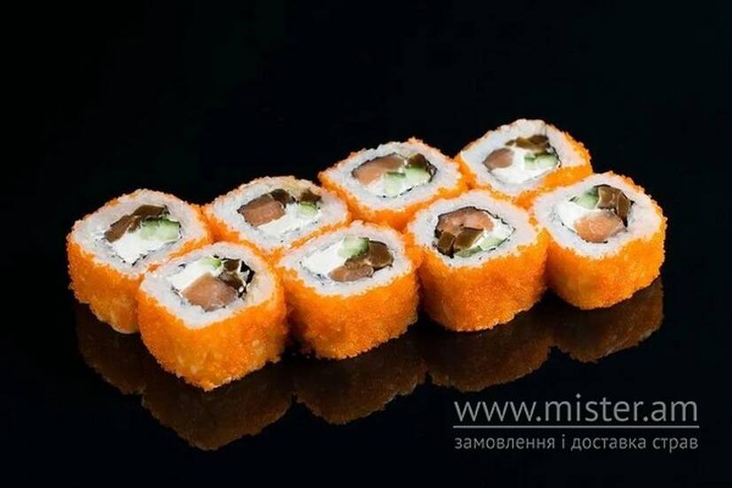 рис, лосось, норі, сир Філадельфія, гриби шиітаке, огірок, ікра Тобіко.