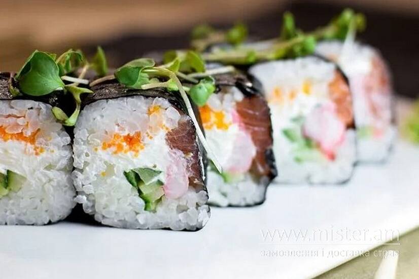 Рис, норі, тигрова креветка маринована лосось, сир Філадельфія, огірок, ікра Тобіко.