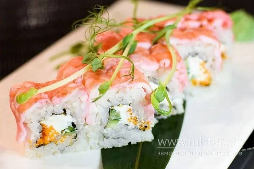 Рис, норі, тигрова креветка маринована, сир Філадельфія, огірок, ікра Тобіко.