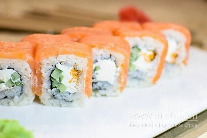 Рис, норі, лосось, сир Філадельфія, ікра Тобіко, огірок.