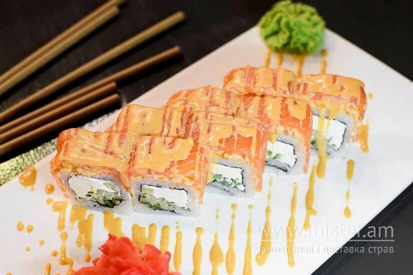 Рис японський, лист Норі, огірок, сир Філадельфія, лосось, крабові палички, майонез японський, соус Шрірача, ікра Тобіко, соус спайсі.