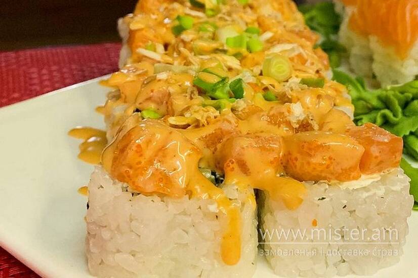Рис, лист норі, огірок, сир Філадельфія, гриби шиїтаке, лосось, соус Шрірача, ікра тобіко, соус спайсі, цибуля зелена, цибуля сушена, японський майонез.