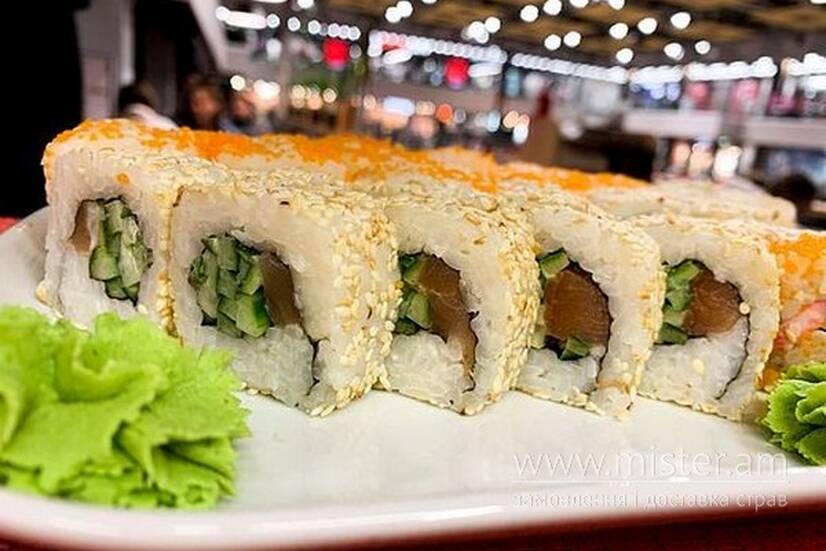 Рис, норі, лосось, майонез, огірок, кунжут.