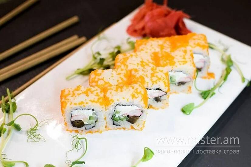 Рис, креветка маринована, норі, сир Філадельфія, гриби шиїтаке, огірок, ікра Тобіко.