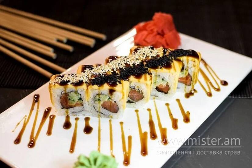 Рис, лосось, огірок, сир Хохланд, норі, майонез, соус унагі, кунжут.