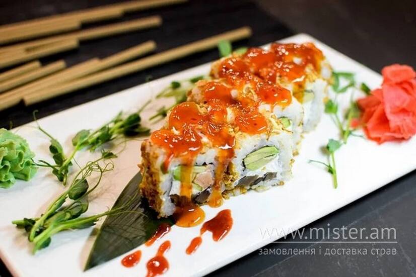 Рис, лосось копчений, крем-сир Філадельфія, авокадо, гриби шиітаке, цибуля сушена, соус шрі рача, солодкий чілі.