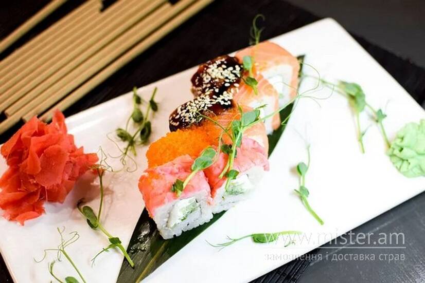 Рис, норі, креветка, вугор, лосось, сир Філадельфія, ікра Тобіко, огірок, соус унагі, кунжут.