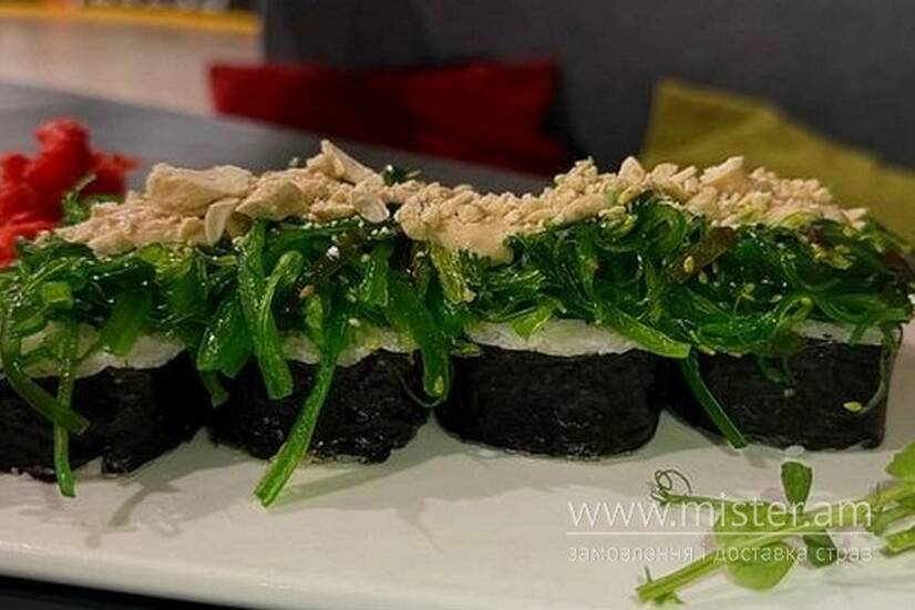 Норі, водорості вакаме, салат айсберг, огірок, рис, гриби шиїтаке, авокадо, горіховий соус, горішки кеш`ю, кунжут.