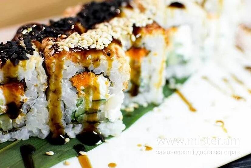 Рис, норі, вугор, огірок, сир Філадельфія, ікра Тобіко, соус унагі, кунжут.